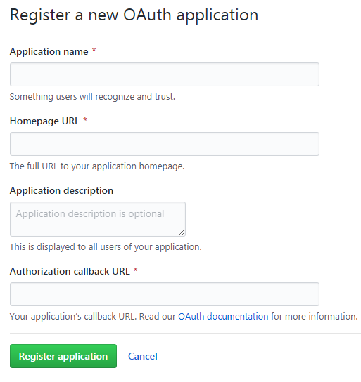 请点这里打开GitHub的OAuth应用创建页面,输入博客名字、主页地址、描述和调用地址。请注意:主页地址和调用地址都要填你的博客的地址。