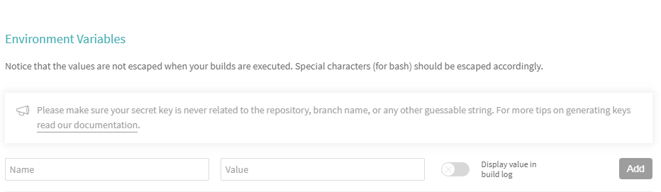 打开Travis CI,点开你新建的项目,在Environment Variables里,在Value处粘贴那串值,名字随意,然后点击Add。